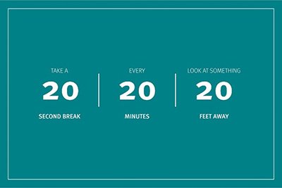 ● Every 20 minutes, look at something 20 feet away for at least 20 seconds. This reduces eye fatigue and helps your eyes relax, especially when working on computers, phones, or tablets.